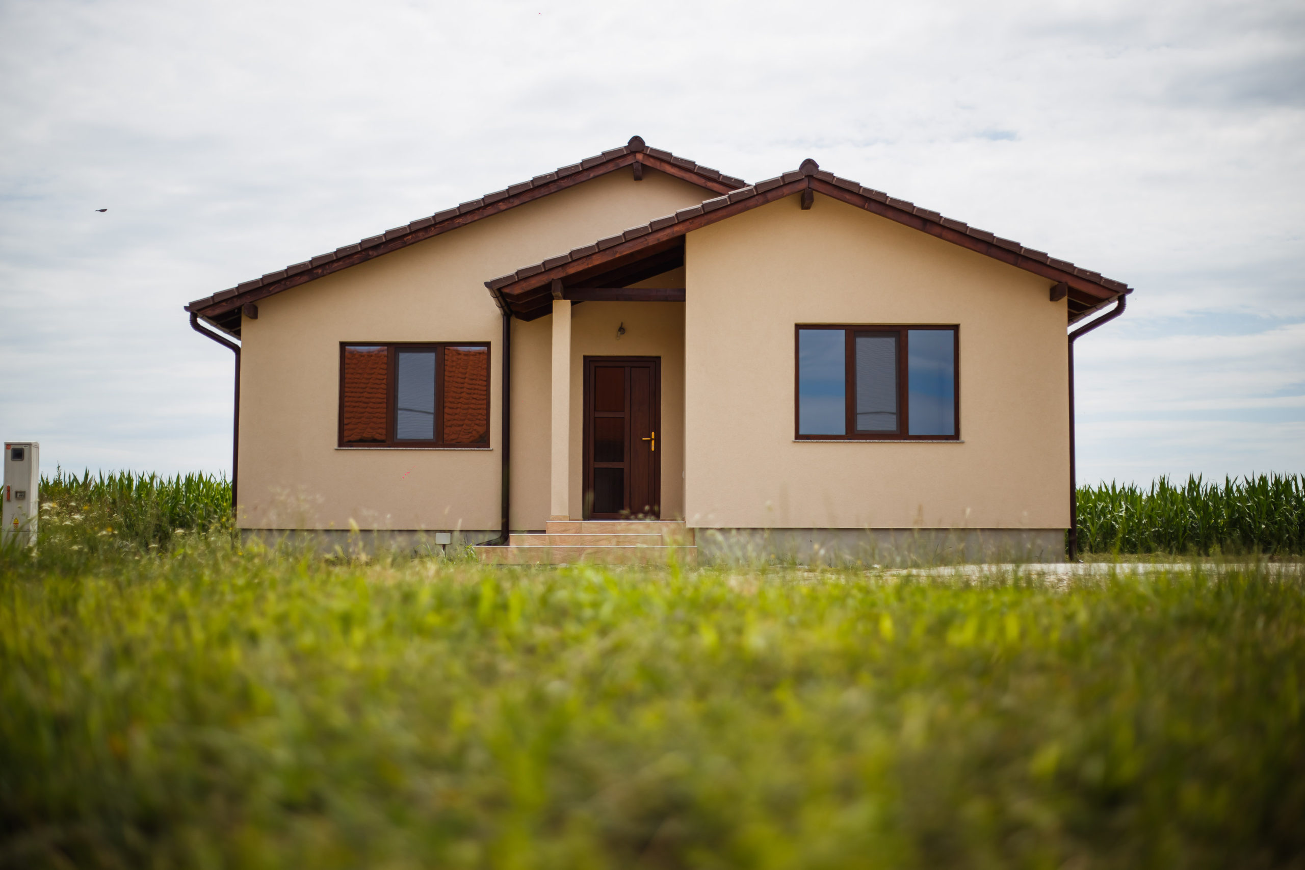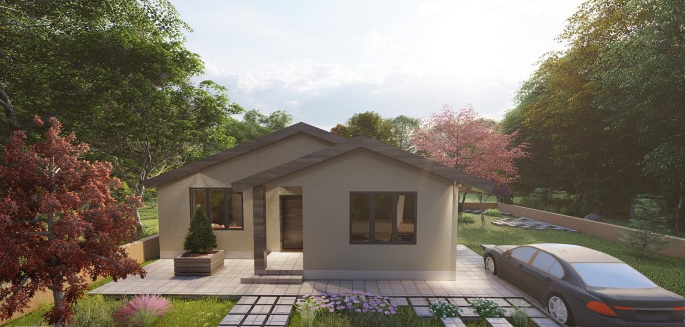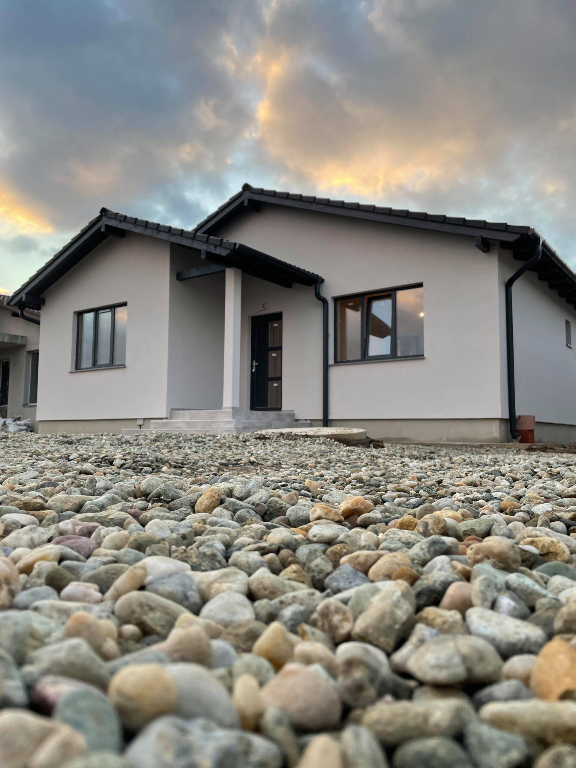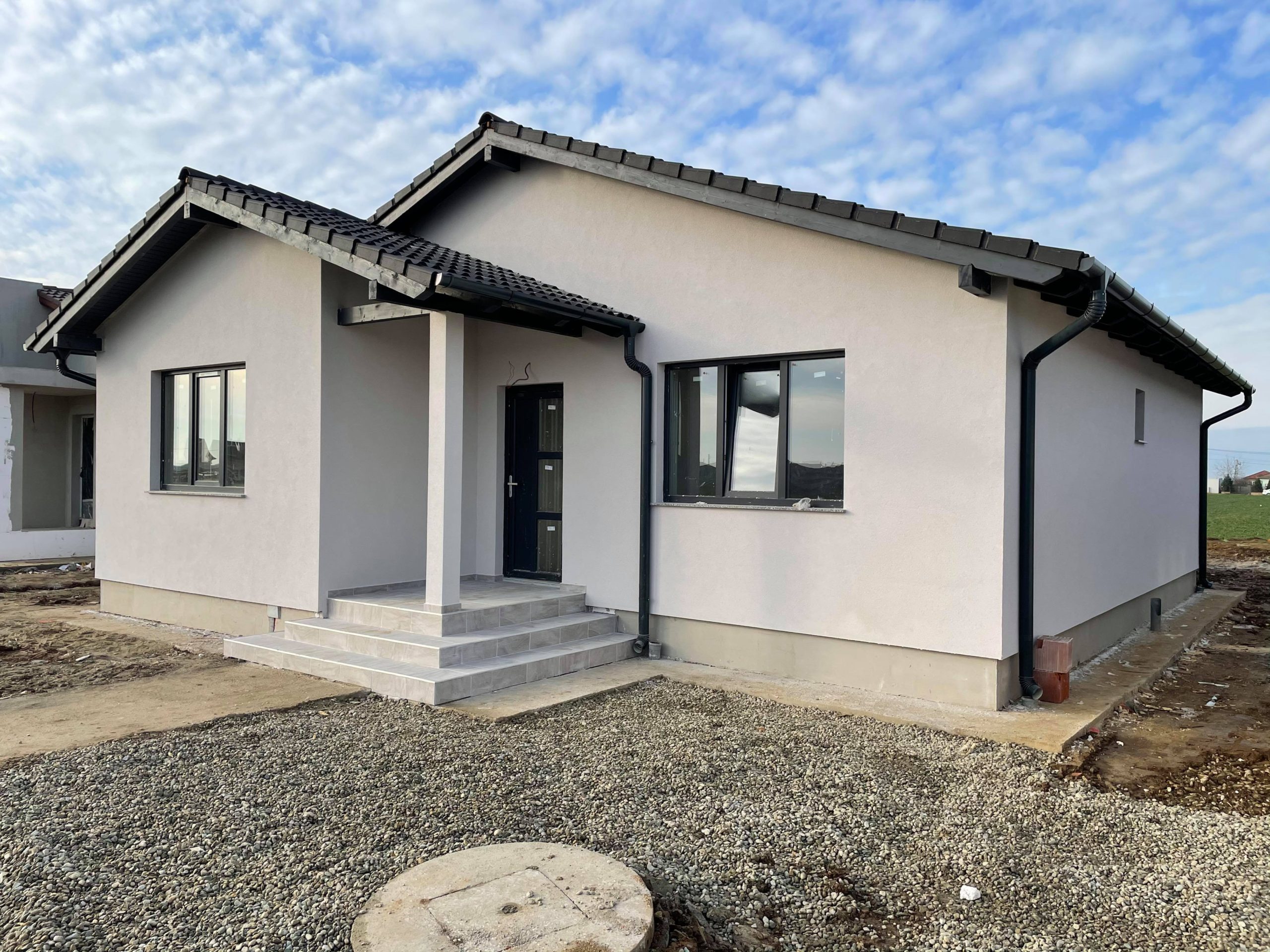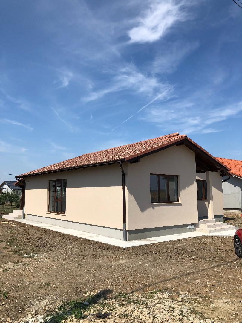 este executat cu țiglă din beton IMCOP iar burlanele și jgheaburile de culoare maro sunt incluse în preț.